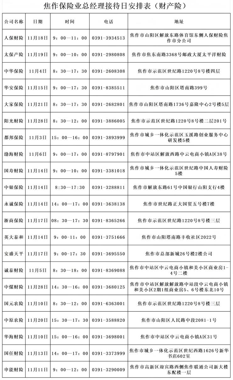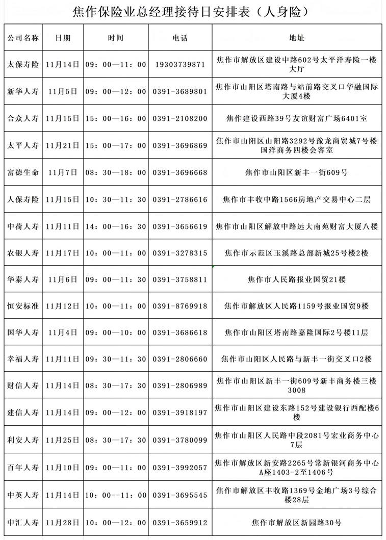 为进一步提升辖区保险消费者权益保护工作,加强保险机构和保险消费者间的信息沟通,不断提高保险服务质量,现将焦作保险业2025年11月总经理接待日安排公告如下: