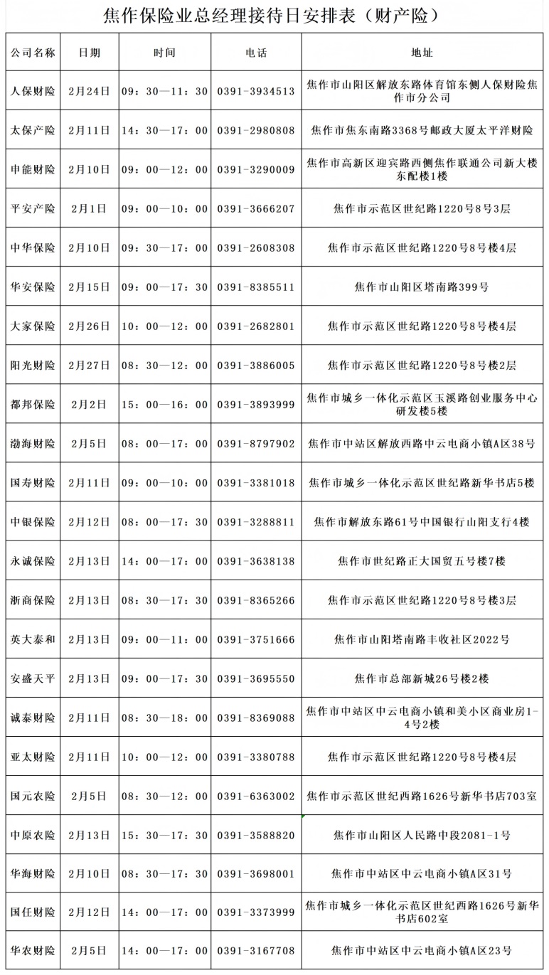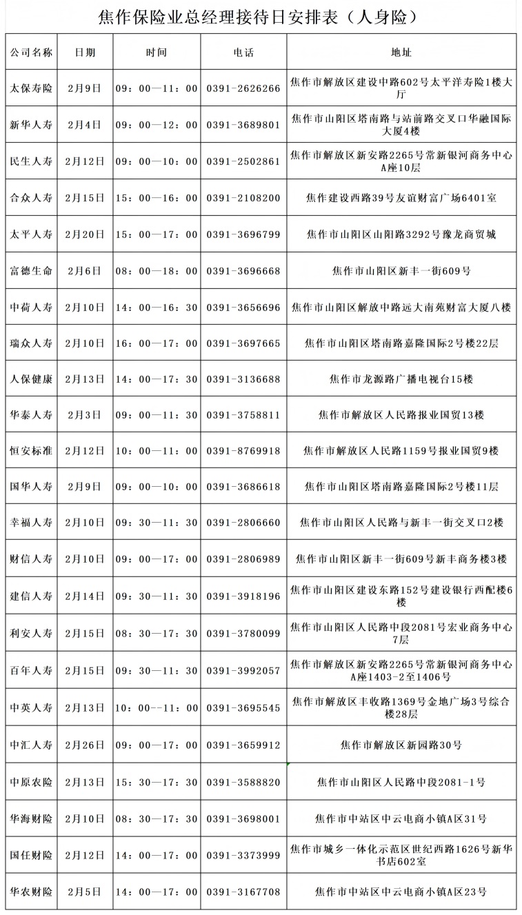 为进一步提升辖区保险消费者权益保护工作,加强保险机构和保险消费者间的信息沟通,不断提高保险服务质量,现将焦作保险业2026年2月总经理接待日安排公告如下: